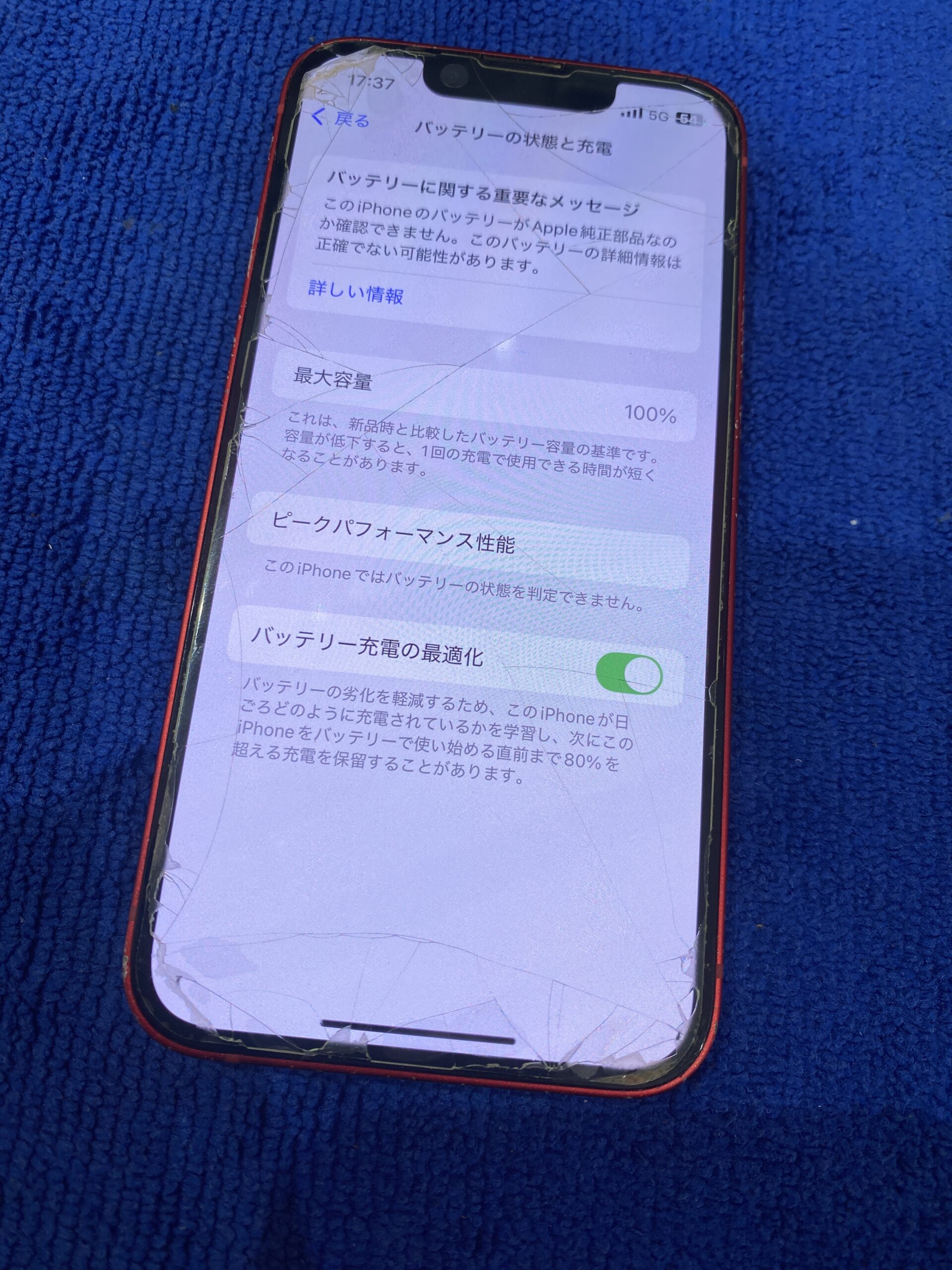 iPhone13miniのバッテリー交換のご依頼をいただきました。 現在はiPhone17シリーズが最新ナンバリングですが、miiniはなかったのでminiシリーズの最新モデルはiPhone13ということになります。 iPhone17シリーズが発表後、miniシリーズはバッテリー交換ご依頼をたくさんいただきました。 あれから数ヶ月経ちますが依頼はまだまだきております。 こちらのiPhone13miniもバッテリー交換を行ったのですが、ちょっと特殊なケースとなりました。 こちらは画面が既に割れております。 iPhone13の電池交換は画面を取り外して交換する仕様です。 ですので、画面が割れている以上、修理過程で画面が破損する可能性もあります。 既に他店での相談時にも同じ箇所を指摘され修理するならば画面とセットになるとのことでした。 当店でも案内自体は同じであり、基本的には画面が割れているときは画面とセットでご案内。 ただし、画面に対してのリスクがある上で電池交換だけおねがいしたい!というなら試みることは可能! 交換は済みましたが、画面の割れが全く進行していないとはさすがに言い切れません。 ですがタッチ操作、液晶表示も現状では問題ないため画面交換の必要性は現在、確認できません。 ですがもし画面の破損があるようでしたら、画面交換料金もかかりますのでご注意ください! また全ての修理前には必ずデータのバックアップをとりましょう! スマホ修理ドットコム川口店公式ホームページは下のバナーをクリック