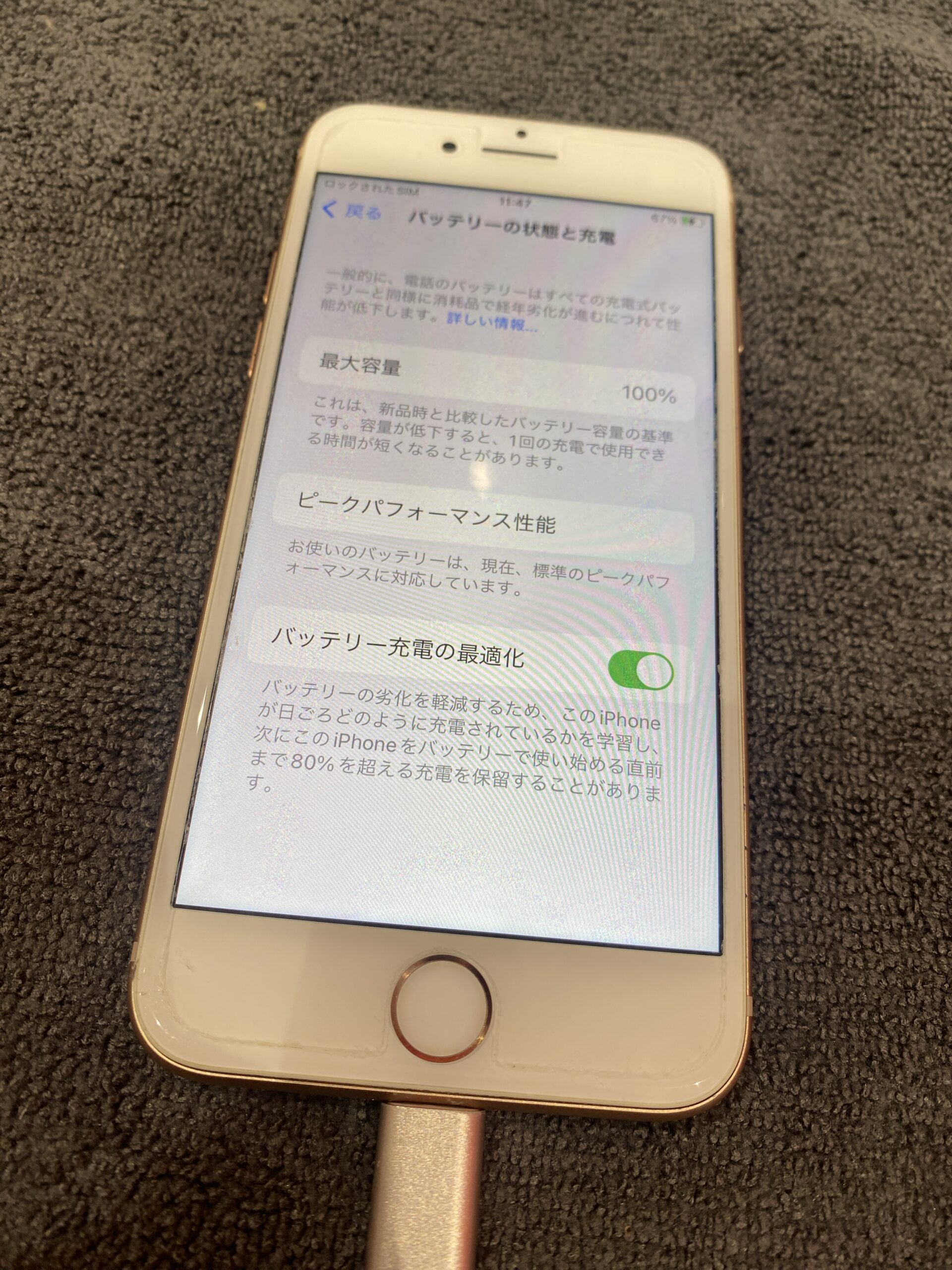 皆様はiPhone8の発売日をご存知でしょうか? iPhoneは2017年に発売されたモデルになります。 現在は2026年となりますのでもう9年目ですし来年は10年目となります。 時が経つのは非常に早いです。 しかし、このiPhone8はそんなこともなくバッテリー最大容量は100パーセント。 これは新品時の数字であり時が止まっております。 固体としてかなり良いものに当たったので長持ちしている、などということは全くありません。 本来、使用方法にもよりますが2年から3年程度で電池は交換時期を迎えることになります。 つまり最大容量が100パーセントのままということはありえません。 また充電口にケーブルを挿入したままでないと使用できない状態でもあります。 消耗が大きいため、正確な数字を認識できないのだと思われます。 交換後にもきちんと最大容量は100パーセントと表示されております。 新品のバッテリーを使用しているためこの数字になります。 交換後には、少々通常よりもお預かり時間をいただくことができたため、様子を見ておきました。 特に電源が急に落ちることもなければ、ケーブルを挿入していないと使用できない、ということもありませんでした。 最大容量がどれだけ良い数字でも、実際に問題が起きているならぜひ修理をご検討ください。 特に電源周りのトラブルは通常使用することが困難な場合もあるので早めにご相談ください! スマホ修理ドットコム川口店公式ホームページは下のバナーをクリック 公式LINEから修理相談受付中です!