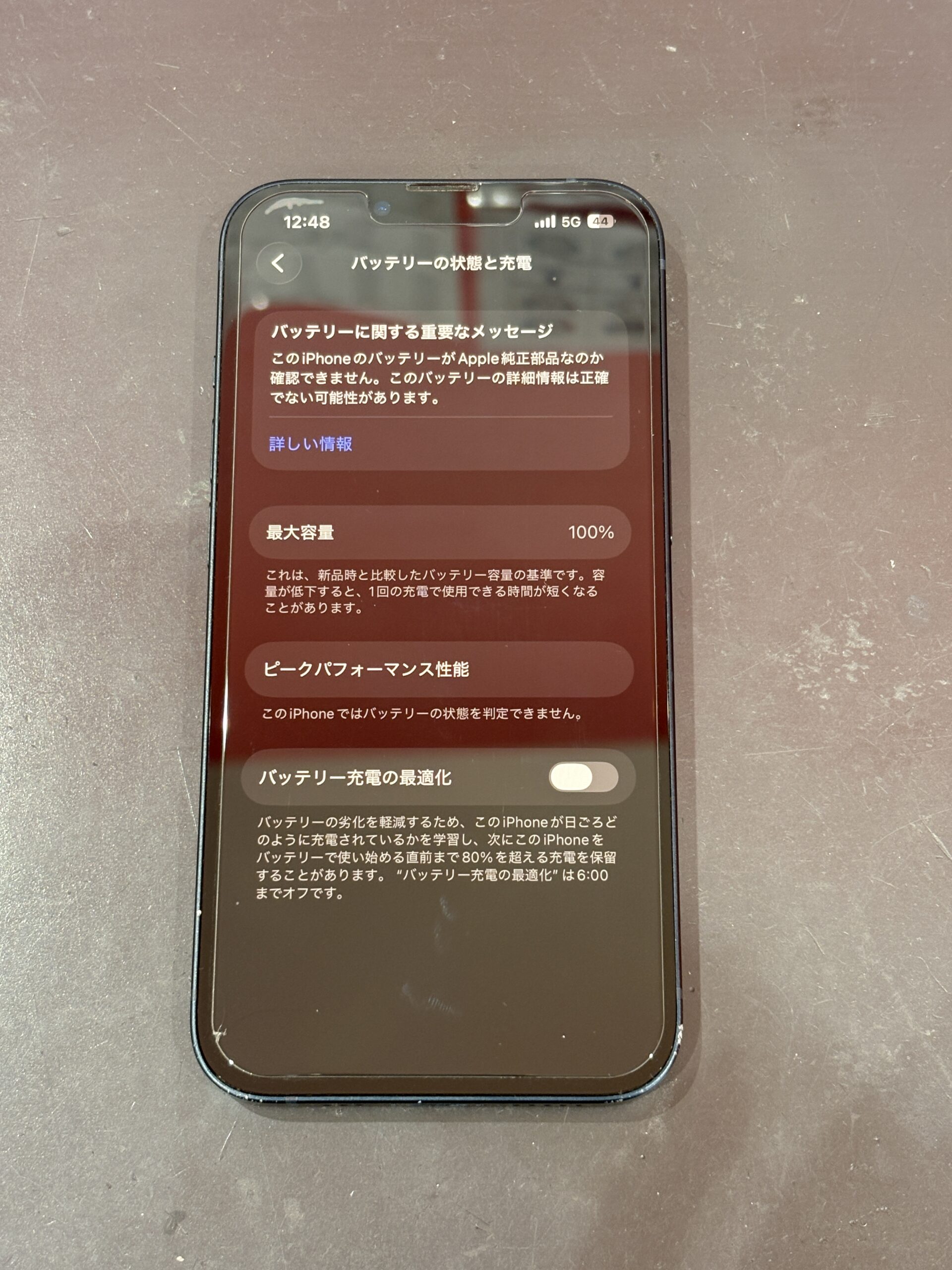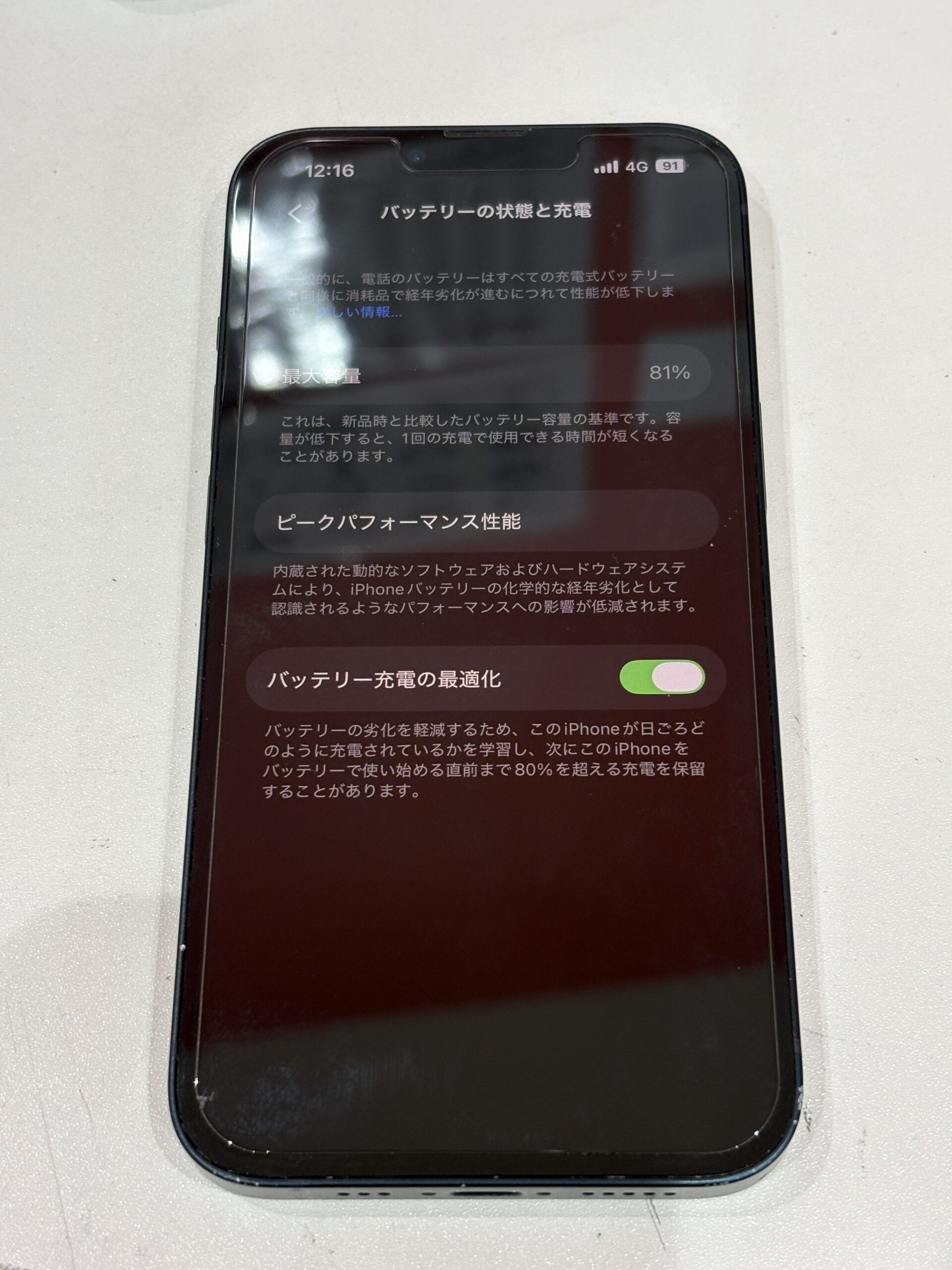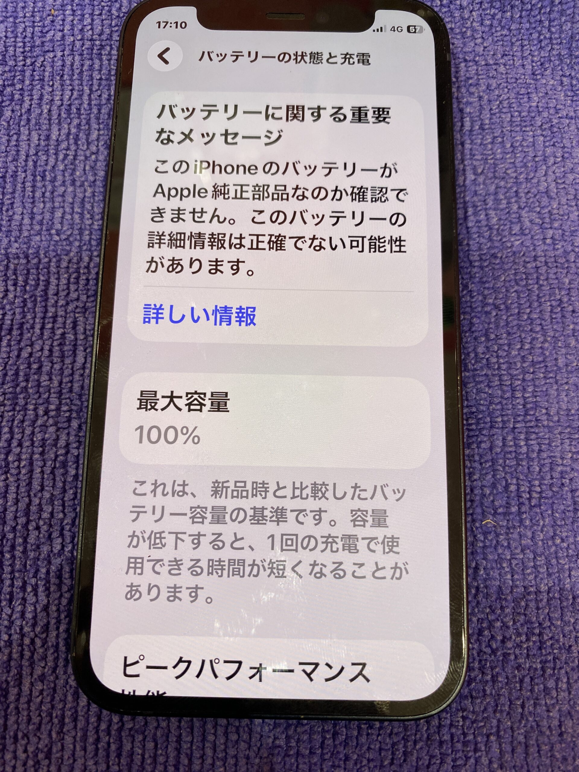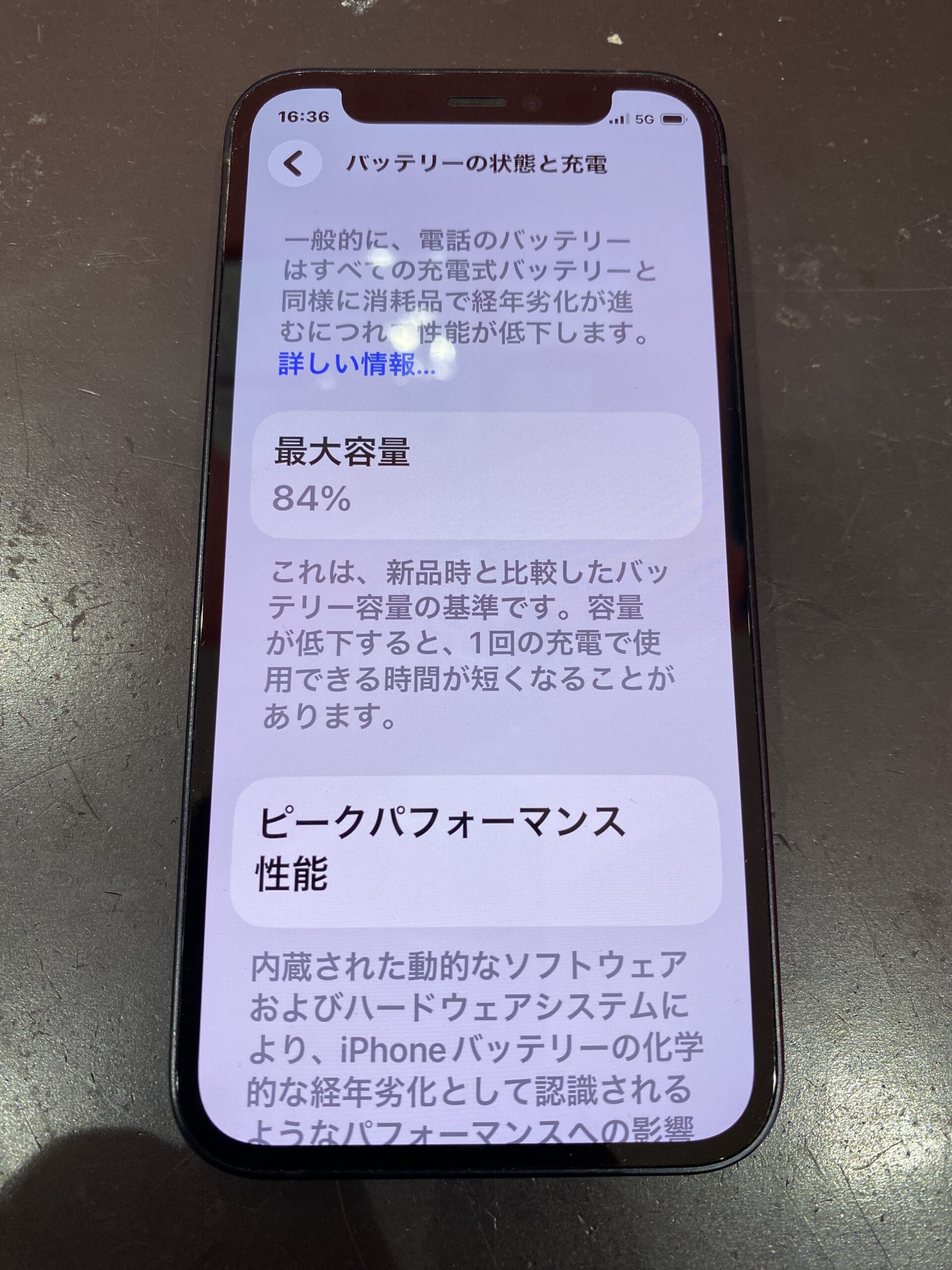 iPhone12miniの電池交換ご依頼をいただきました。 いよいよ本格的にゴールデンウィーク前にして様々なモデルのiPhone電池交換依頼をいただいております。 特にminiシリーズは発売から年数が経過しております。 まだ一度も電池交換を行っていないという方のminiシリーズはすでに交換時期を迎えている可能性が高いです。 現在のiPhoneではバッテリーの消耗状態は簡単に確認することができます。 設定画面からバッテリーの項目を開き、バッテリーの状態と充電を開くと写真と同じ画面になります。 画面の大体真ん中付近にある最大容量、という項目が現在のバッテリーの状態を表しています。 新品時の100パーセントから徐々に減少していきます。 画面上部の交換を促すメッセージは最大容量が79パーセントまで数字が減ると現れます。 79パーセントは数字として見ると比較的高く見えますが実際にはかなり持ち時間が減少しています。 特にミニシリーズは他のiPhoneと違い電池のサイズが小さいので余計に持続時間の低下を感じやすいです。 ミニシリーズは上記の通りバッテリーの消耗を感じやすいモデルです。 持続時間の短さがきになった方は、一度、設定画面からバッテリーの状態を確認しましょう。 1枚目の写真と同じように交換を促されているメッセージがでているならぜひバッテリー交換をご検討ください。 スマホ修理ドットコム川口店公式ホームページは下のバナーをクリック 公式LINEより修理相談受付中です!
