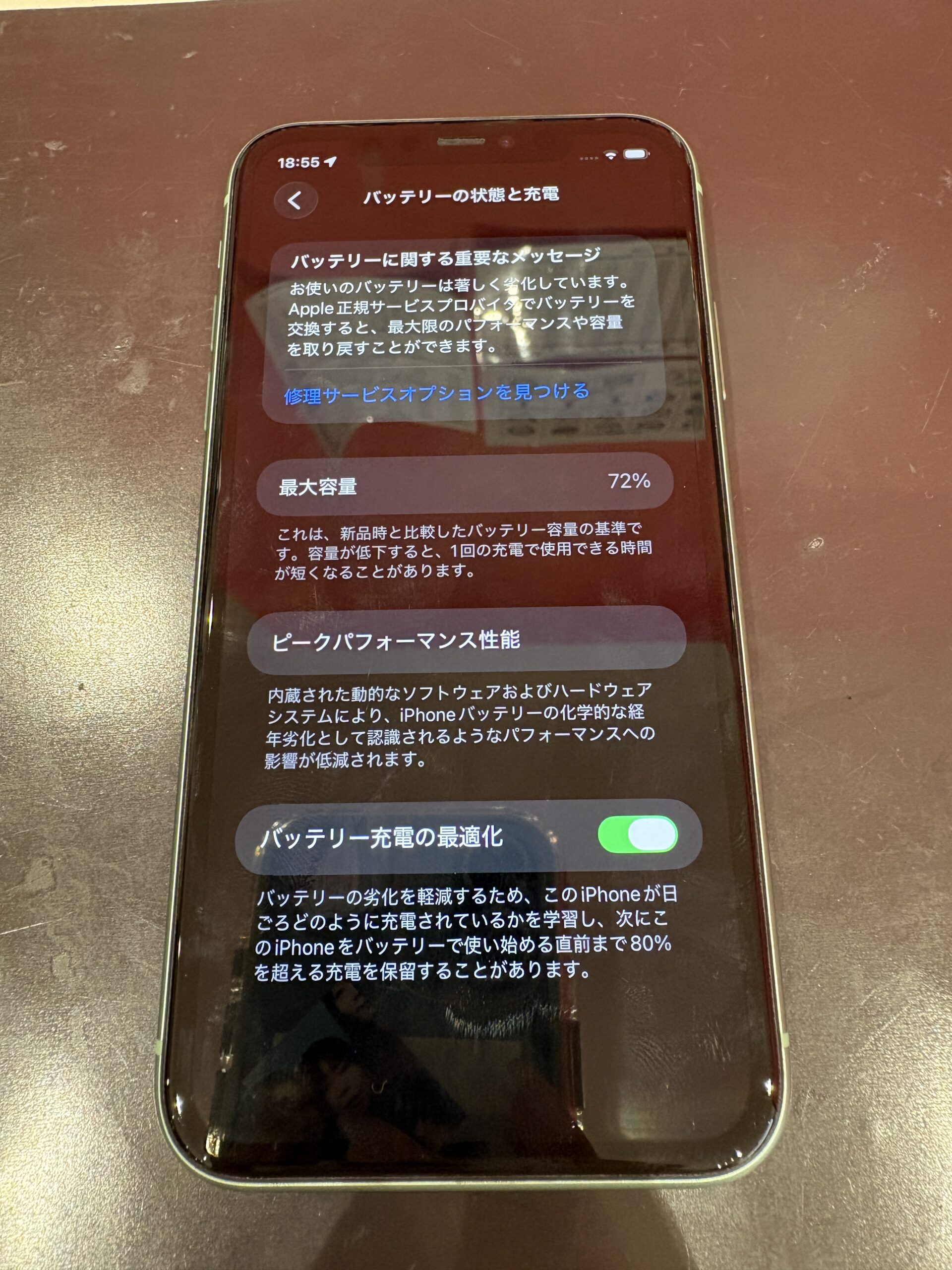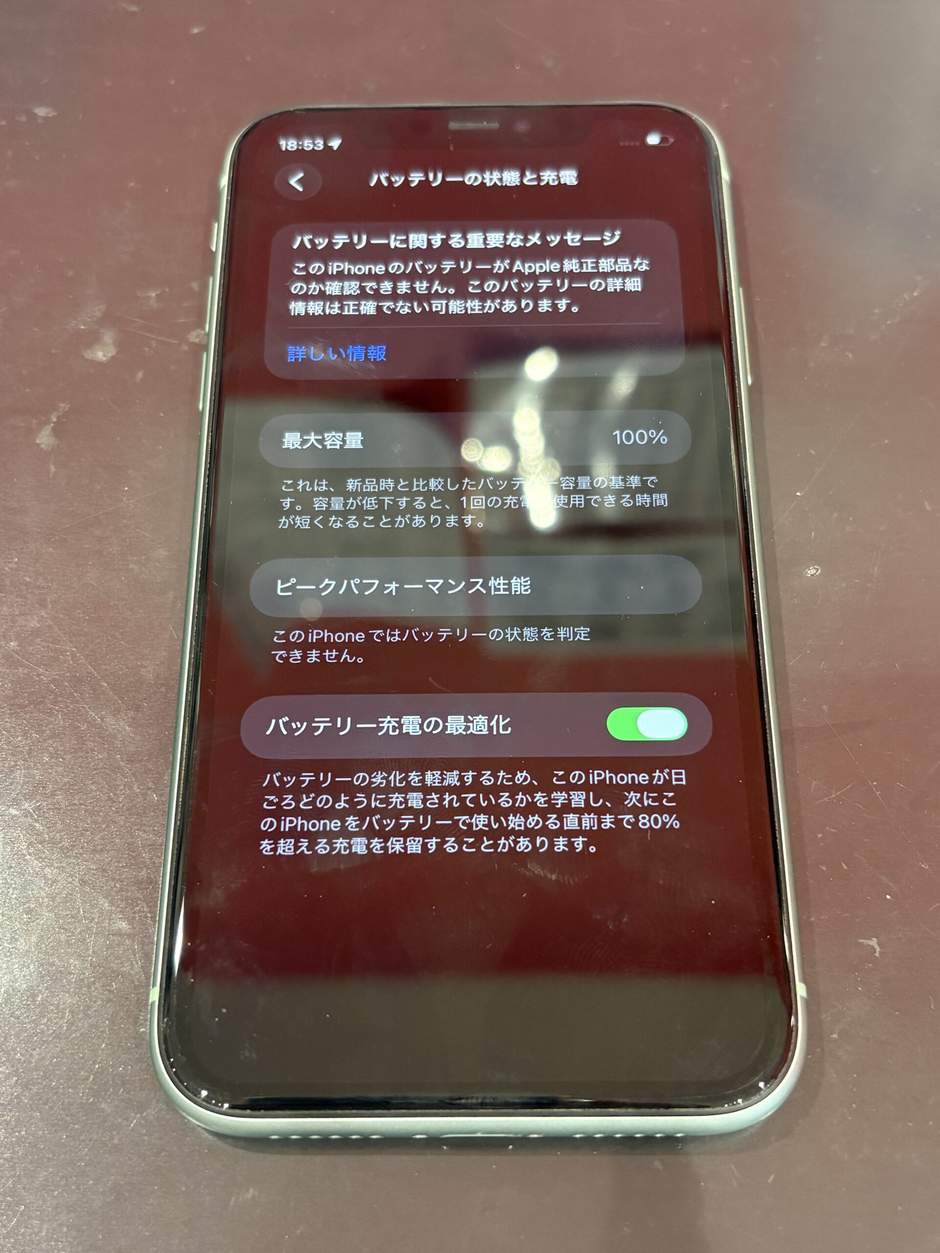 ▶︎修理概要 機種:iPhone11(2019年発売) 症状:充電持ちが悪い 修理内容:バッテリー交換 作業時間:最短30分 ※当日の混雑状況によって修理時間が前後する可能性がございます。 ▶︎発売から今年で7年目 iPhone11シリーズは今年で7年目の機種になります。 7年が経過している機種ですが、現在も修理依頼も多く、 使い続けているかたも多く見受けられます。 今回お預かりしたiPhone11のバッテリー状態は72% 100%まで充電をしても、実質「72%」程度またはそれ以下しか充電ができていない状態です。 使っていて不便だな。と感じる方はバッテリーの交換をおすすめしております。 なので、バッテリーの劣化メッセージがある状態でも使っていて問題がなければバッテリー交換は不要です。 ▶︎iPhone11 バッテリー交換完了後 バッテリー交換後、最大容量は100%に復活いたしました。 充電機能、その他動作チェックを行いまして修理は以上となります。 iPhone11シリーズにつきまして、 バッテリー即日修理が可能機種となっております。 修理ご希望の方は直接店頭までご来店ください! ▶︎修理相談はLINEから! ▶︎iPhone11シリーズ 関連記事 iPhone11電池交換を行いました!忙しい時期なのでご予約を! 【川口市】iPhone11ProMax 画面割れ修理|操作できない症状を即日修理 【即日修理】iPhone11Pro 画面割れをその場で修理|川口市