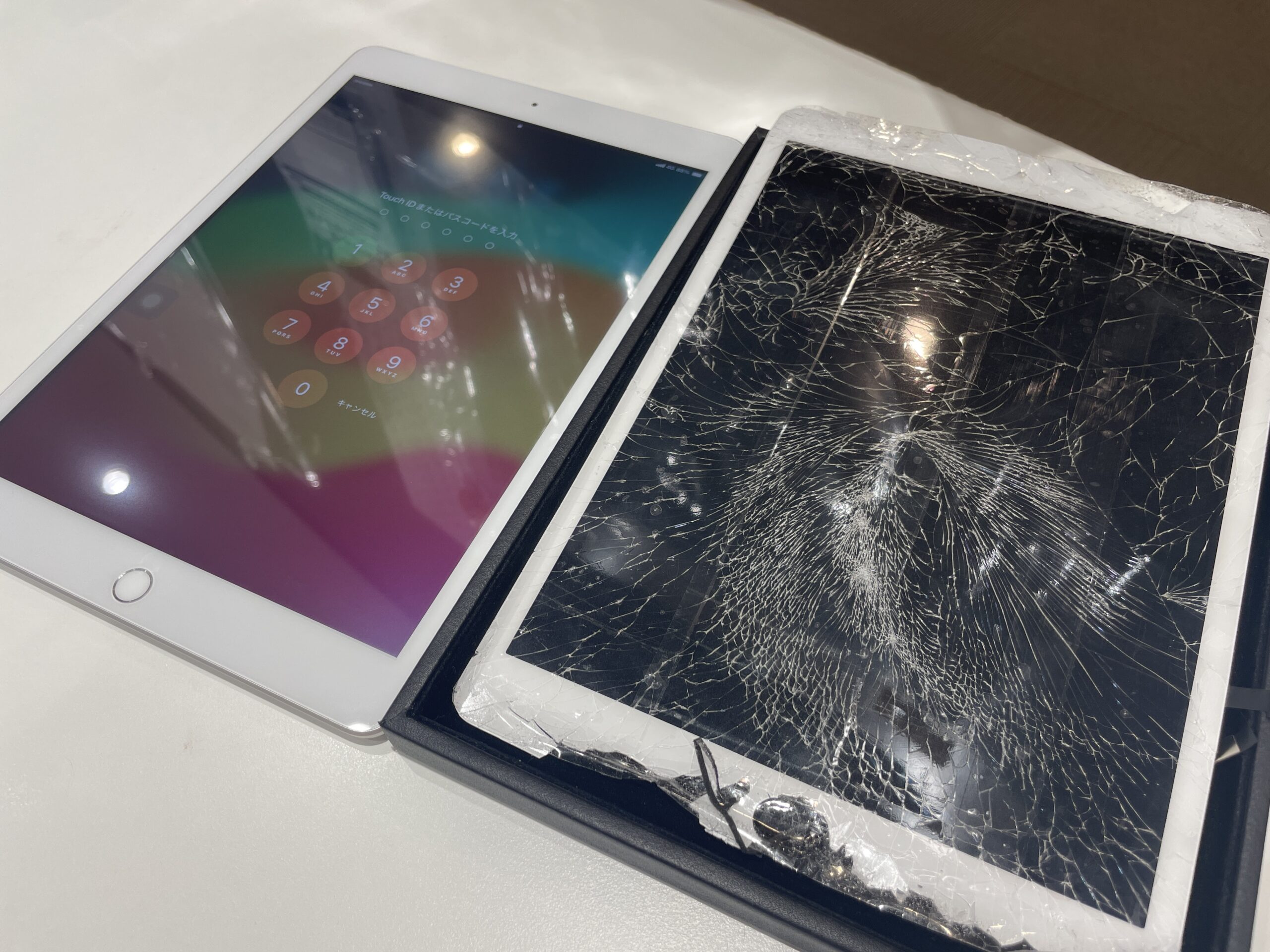 ▶︎修理概要 機種:iPad第7世代(2019年モデル) 症状:画面割れの影響でタッチ操作が不可 修理内容:ガラス交換 作業時間:最短2日 ※iPadの場合、圧着の時間が必要なため、最低2日程度お時間をいただいております。 ※取り寄せが必要な場合は、お預かり期間が延びる可能性がございますので、あらかじめご了承いただけますと幸いです。 ▶︎iPad第7世代/修理前・修理後 自宅にて謝って本体を踏んでしまい、ガラスがバキバキに割れてしまった影響で タッチ操作もできない状態でのお預かりになります。 幸いにも液晶は無事でしたので、今回はガラスのみ交換・修理を行いました。 ▶︎iPad(アイパッド)ガラス割れ修理はなぜ日にちがかかるのか iPadのガラスはネジなどで固定されておらず、接着剤で固定されております。 そのため、ガラス交換後は接着剤の硬化処理が必要なためお日にちをいただいております。 この硬化処理は非常に重要で、少しでも短縮してしまうと画面浮きのリスクが上がるためとても重要な作業です。 ▶︎iPad(アイパッド)修理について 店頭またはお電話やLINEにて修理相談やお見積もりが可能でございます。 LINEからの場合、友だち追加後に届きますメッセージに沿ってご返信いただけますとスムーズとなります! ▶︎iPad(アイパッド)修理に関する関連記事 iPad 充電口に異物が詰まった!ライトニング端子取り出し!【川口市】 【要注意】iPad第5世代 バッテリー膨張|画面浮き修理・バッテリー交換【川口市】 【西川口より】iPad第8世代 A2270 ガラス割れ修理を行いました。