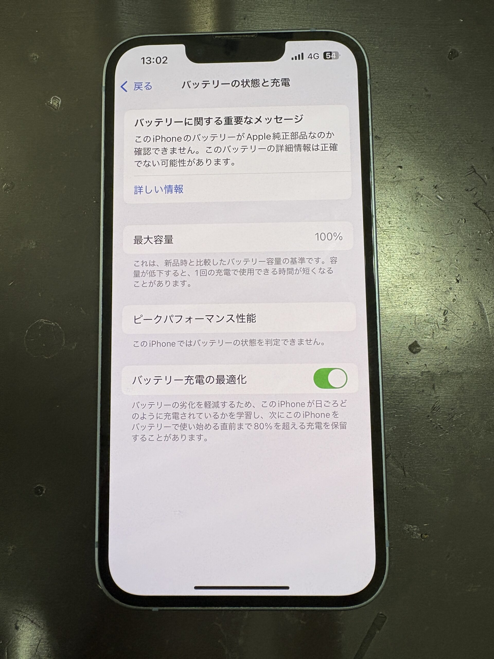 今回はちょっと訳ありのiPhone電池交換を行いました。 対象となったモデルはiPhone 13! 訳ありの内容は画面に若干のひび割れがあるためです。 こちらのiPhone 13はガラスのひび割れ、そして貼られているフィルムもまたひび割れ状態です。 既に他店での修理をお願いしたそうですが、画面の割れがあるため画面と電池交換。 この同時でないと受付できないと言われたそうです。 実際にiPhone 12以降のディスプレイは取り外すのが非常に難易度が高いためこれは致し方ありません。 当店でも画面に傷がある際の電池交換に関しては画面とバッテリー同時でおすすめはしております。 ただ、ディスプレイの使用不可能になるリスクをご承知いただけるようであれば電池交換のみを行うこともできます。 交換後、最大容量は100パーセントまで回復しております、が! メッセージにもございますが、サードパーティー製のバッテリーであるためこの数字が正しく機能しているかはわかりませんと書かれております。 通常使用する分には問題がないので、このメッセージがでていてもお使いいただけます。 iPhone17シリーズ、Airが発表されて最近は現在ご使用されているiPhoneの電池交換依頼をいただくことが増えました。 時折ですが、在庫を全て使い切ってしまうことがあるため、お電話や公式LINEなどで必ず事前にご相談を! スマホ修理ドットコム川口店公式ホームページは下のバナーをクリック 公式LINEより修理相談受付中です!