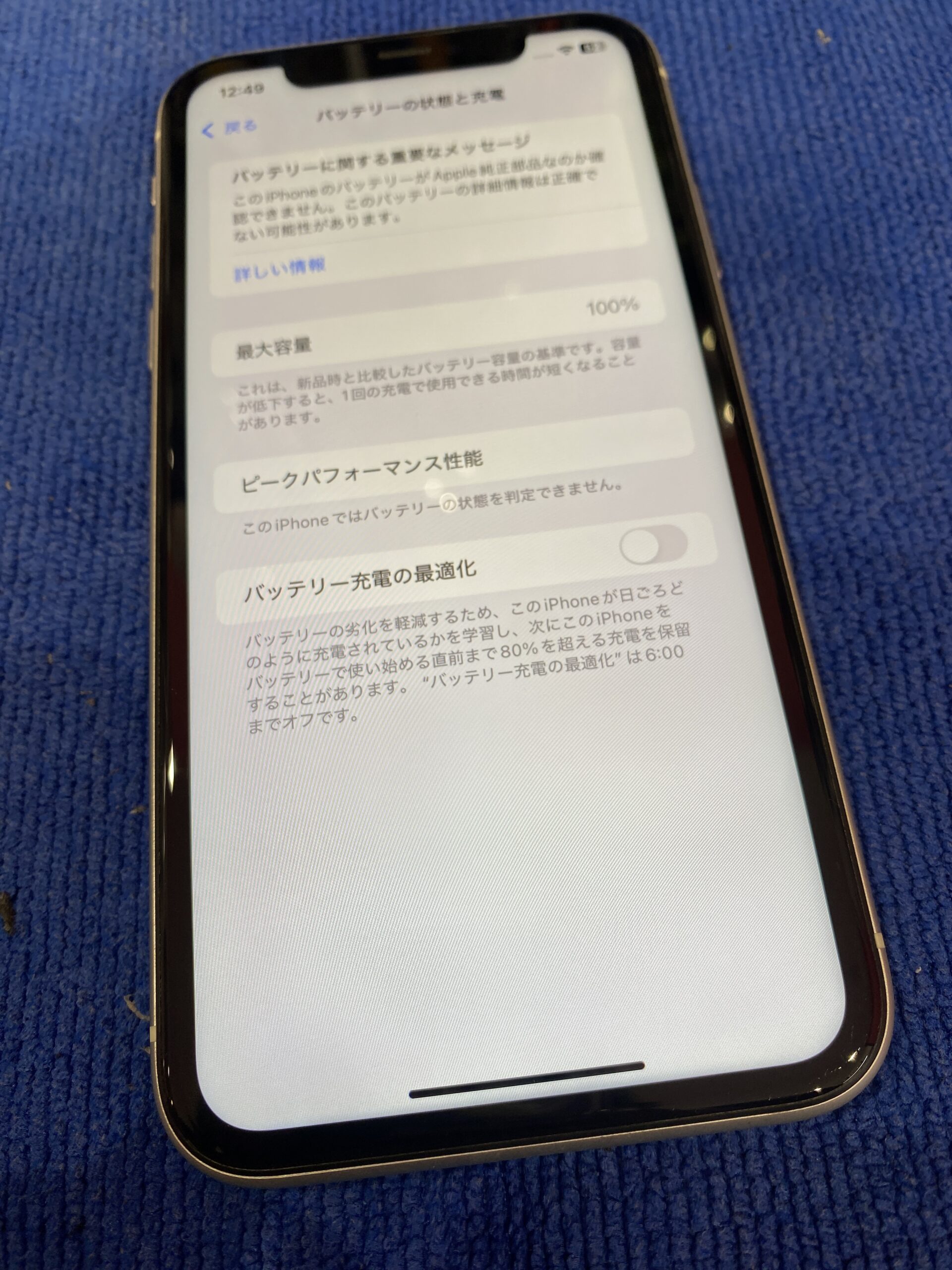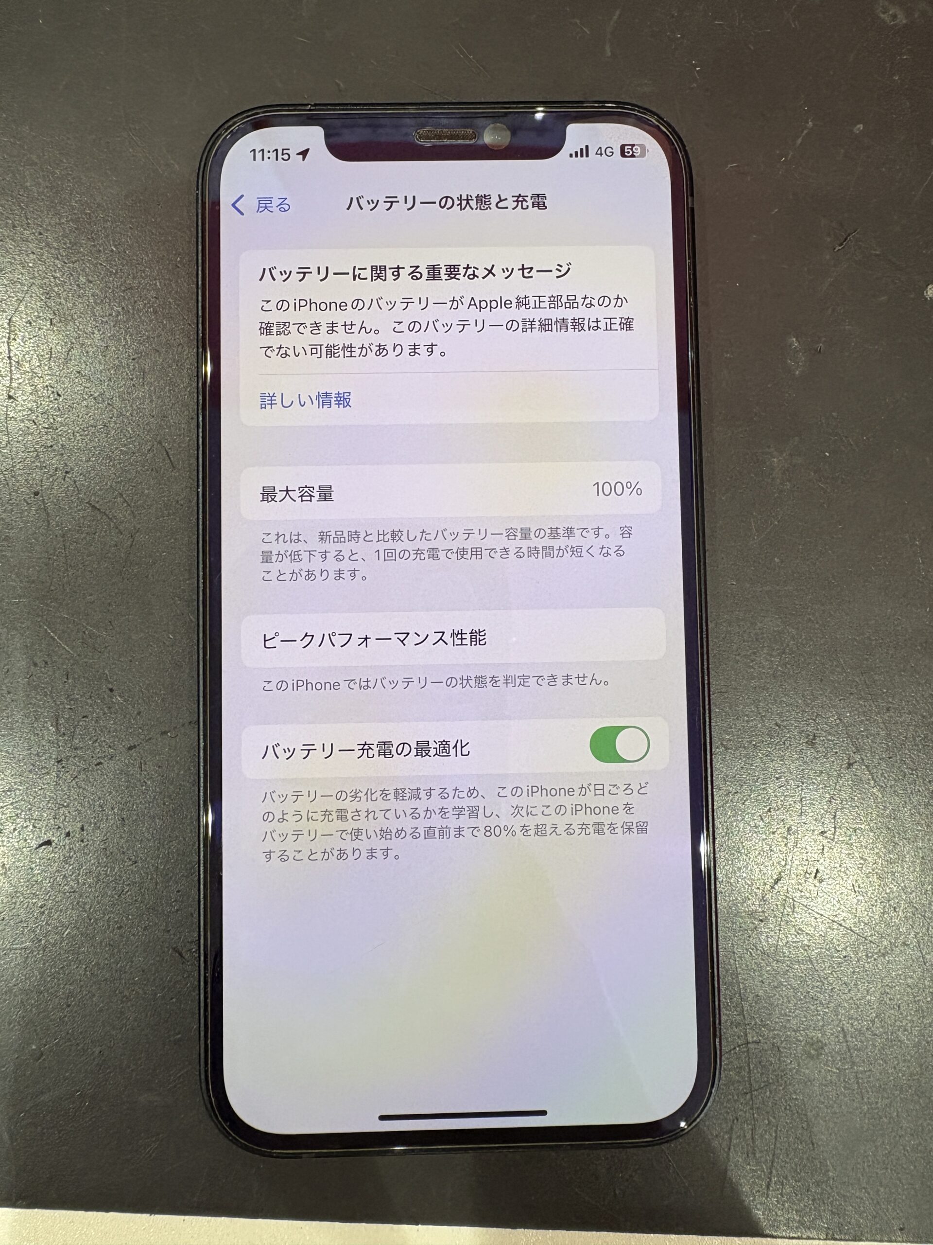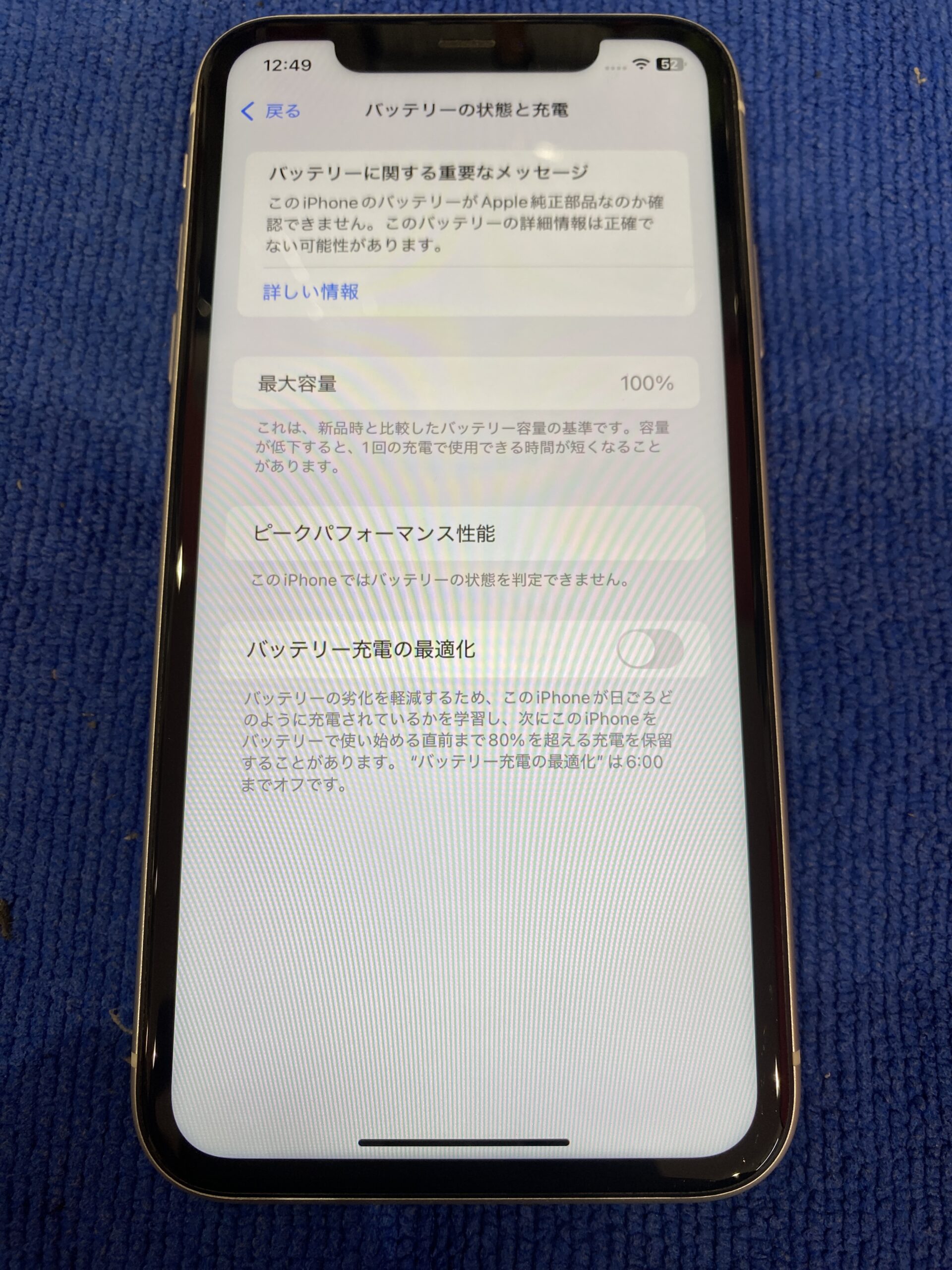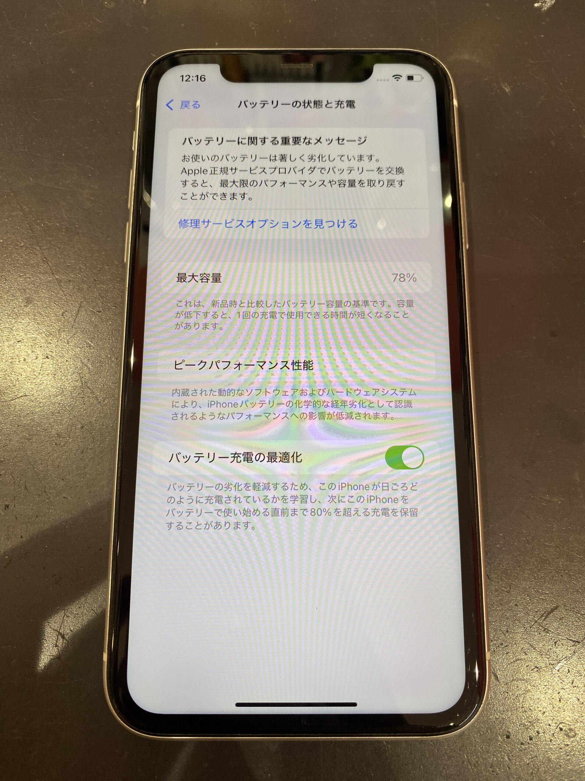 iPhone11の電池交換依頼をいただきました。 結構古い端末ですし、さすがに最新の高スペックを要求されるアプリは動作が厳しいです。 しかし、ただ日常的に使用する分には今でも十分ですし、特に困ることはありません。 iOSの更新サポートは意外かもしれませんが、まだ続いているiPhoneでもあります。 iPhoneの電池交換目安は現在のiPhoneでは視認できるようになっています。 設定アプリからバッテリーを開いてバッテリーの状態。 そこを選択すると、写真と同じ画面がでてきます。 真ん中付近にある最大容量というのがiPhoneの電池の消耗状態を示しております。 最初は100パーセントの最大容量からスタートします。 徐々に減っていくとこの数字が低下していきます。 最大容量の交換目安は79パーセントとなります。 この数字に達していれば交換を案内するメッセージがiPhone本体に出てきます。 およそ1時間ほどの作業時間でバッテリー交換は終了となりました。 当店のようなアップル意外でのバッテリー交換を行うと現在のバッテリーは不明な部品という扱いになります。 ですが、使用する分にはもちろん問題ございませんので、普通に使用していただくことが可能です。 iPhone11はバッテリー交換ご依頼をよくいただくスマートフォンです。 時折、在庫がないこともあるので事前にご相談ください! スマホ修理ドットコム川口店の公式ホームページは下のバナーをクリック 公式LINEより修理相談受付中です! お気軽にご相談ください!