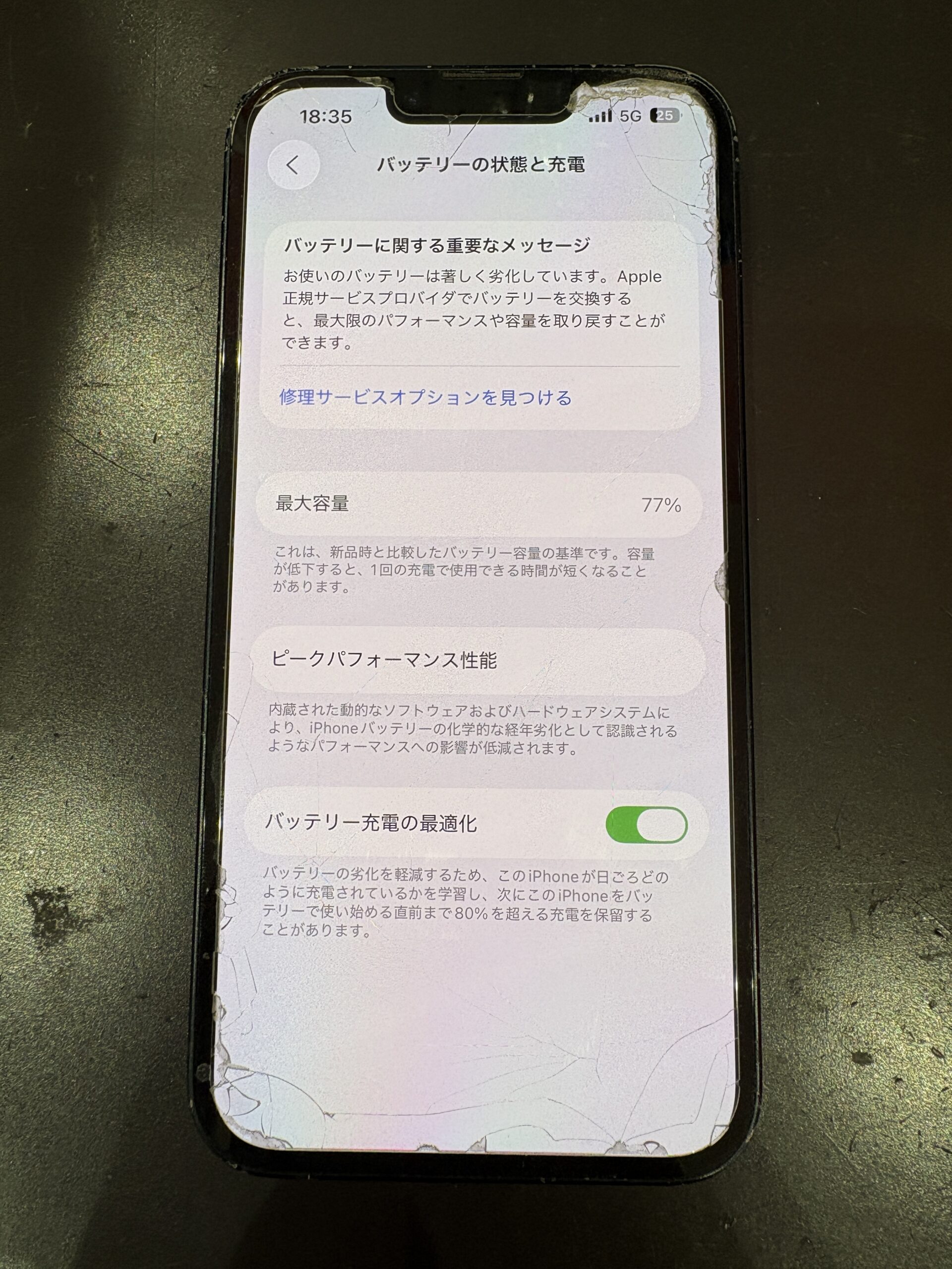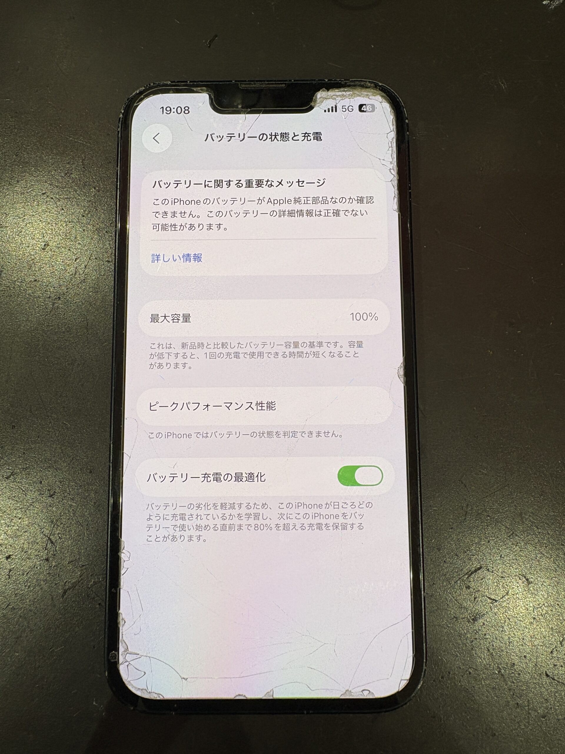iPhone13miniのバッテリー交換のご依頼をいただきました。 現在はiPhone17シリーズが最新ナンバリングですが、miiniはなかったのでminiシリーズの最新モデルはiPhone13ということになります。 iPhone17シリーズが発表後、miniシリーズはバッテリー交換ご依頼をたくさんいただきました。 あれから数ヶ月経ちますが依頼はまだまだきております。 こちらのiPhone13miniもバッテリー交換を行ったのですが、ちょっと特殊なケースとなりました。 こちらは画面が既に割れております。 iPhone13の電池交換は画面を取り外して交換する仕様です。 ですので、画面が割れている以上、修理過程で画面が破損する可能性もあります。 既に他店での相談時にも同じ箇所を指摘され修理するならば画面とセットになるとのことでした。 当店でも案内自体は同じであり、基本的には画面が割れているときは画面とセットでご案内。 ただし、画面に対してのリスクがある上で電池交換だけおねがいしたい!というなら試みることは可能! 交換は済みましたが、画面の割れが全く進行していないとはさすがに言い切れません。 ですがタッチ操作、液晶表示も現状では問題ないため画面交換の必要性は現在、確認できません。 ですがもし画面の破損があるようでしたら、画面交換料金もかかりますのでご注意ください! また全ての修理前には必ずデータのバックアップをとりましょう! スマホ修理ドットコム川口店公式ホームページは下のバナーをクリック