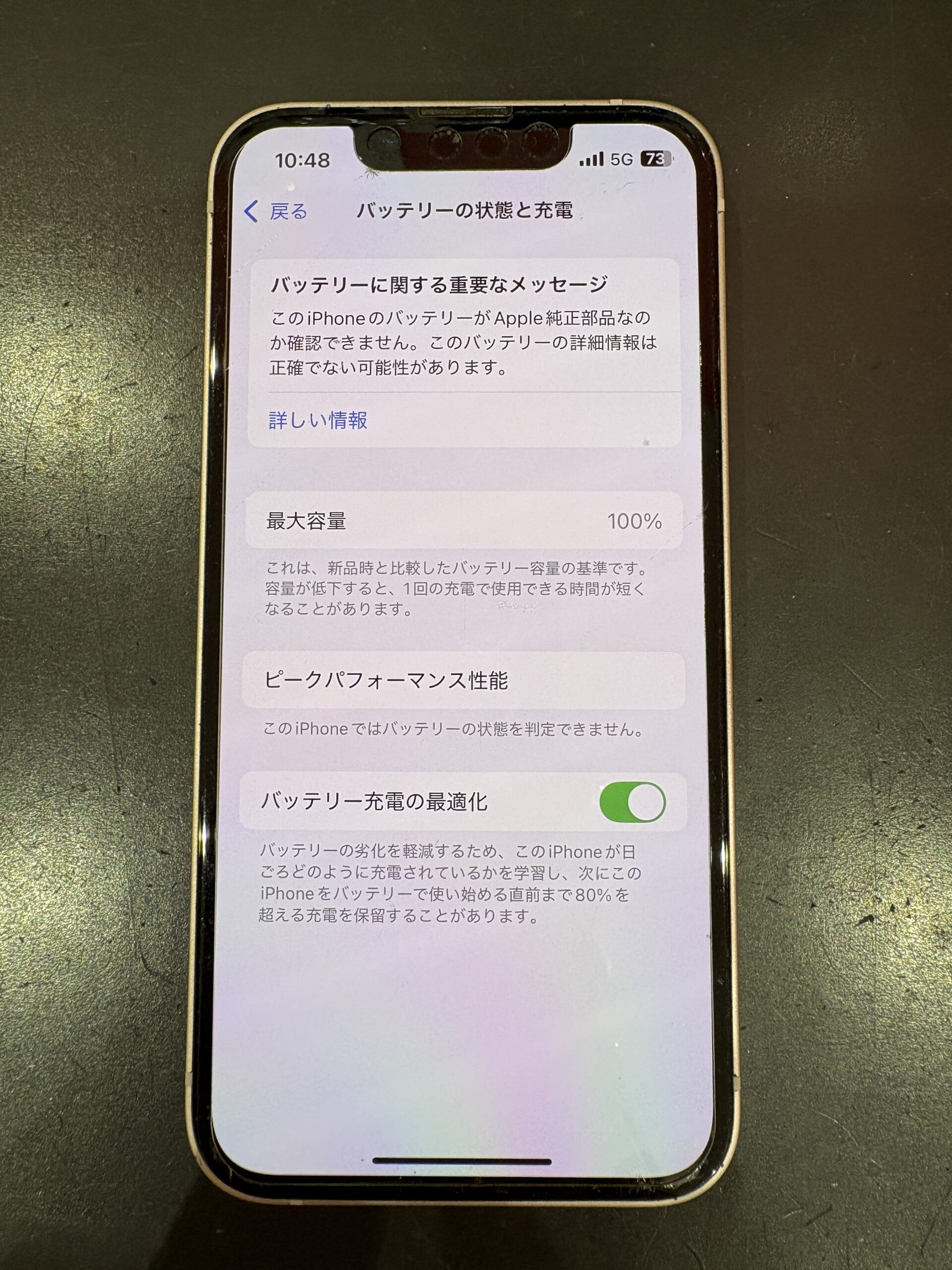 ▶︎修理概要 機種:iPhone13(2021年発売) 修理内容:バッテリー交換 作業時間:約60分程度 ※当日の混雑状況により修理時間変動いたします。 ▶︎ご来店のきっかけ 発売から今年で4年目! 使っていて「充電持ちが・・・」と気になるかたはバッテリー交換目安かも? バッテリー交換目安としては、最大容量が80%を下回った時、または使用期間が3年以上で使っていて充電消耗が激しい時! iPhone13もまだまだアプデ対象の機種になりますのでセキュリティー面でも安心して使える端末です。機種変更も1つの方法ですが、バッテリー交換をして使い続けるもの費用も抑えられるのでおすすめ! ▶︎iPhone13 バッテリー交換完了後 バッテリー交換は無事完了! ios18.1.1以上の場合はバッテリー交換後、最大容量の表示は維持され「100%」の記載に変化します。 バッテリー交換後は隈なく動作チェックを行いましてご返却になります。 当店では「現金」「クレジットカード」の2つからお支払い方法をお選びいただけます。 QRコード決済やタッチ決済には対応しておりませんため、あらかじめご理解いただけますと幸いです。 ▶︎修理に関するご相談 ▶︎さいたま市エリアにてiPhone13シリーズ 修理 受付中! さいたま市より!お風呂に落ちたiPhone13水没修理! 【さいたま市】iPhone13Pro 画面割れ&液晶漏れを即日修理!データそのまま安心交換 バッテリーが膨らんで画面を押し上げたiPhone13mini修理!